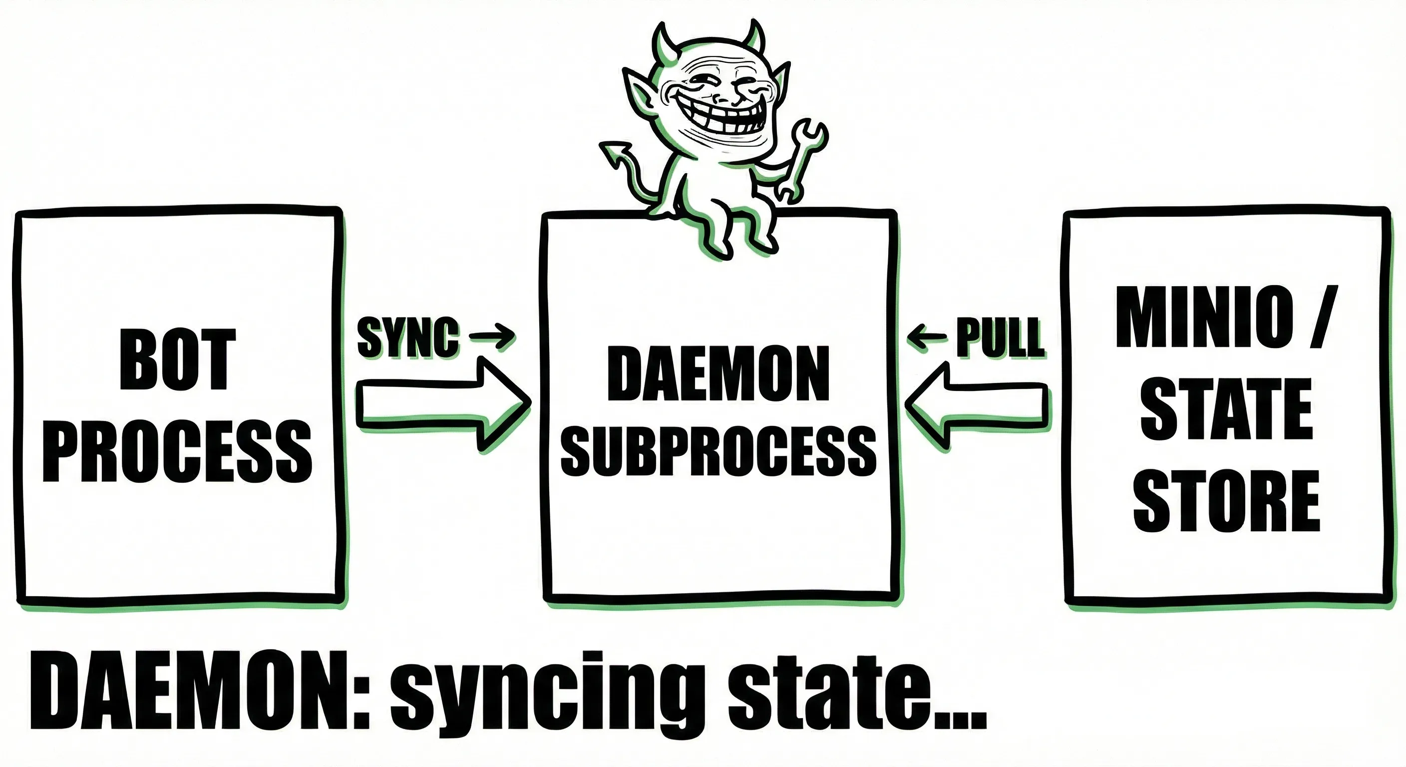 To achieve this we added a daemon process that runs alongside the bot's main execution thread. This daemon is responsible for synchronizing state with an object store (minio). The daemon runs in the background and periodically persists the bot's state to the object store. This way, the bot can maintain its state across executions and restarts without relying on external systems. On Docker, it looks like this: