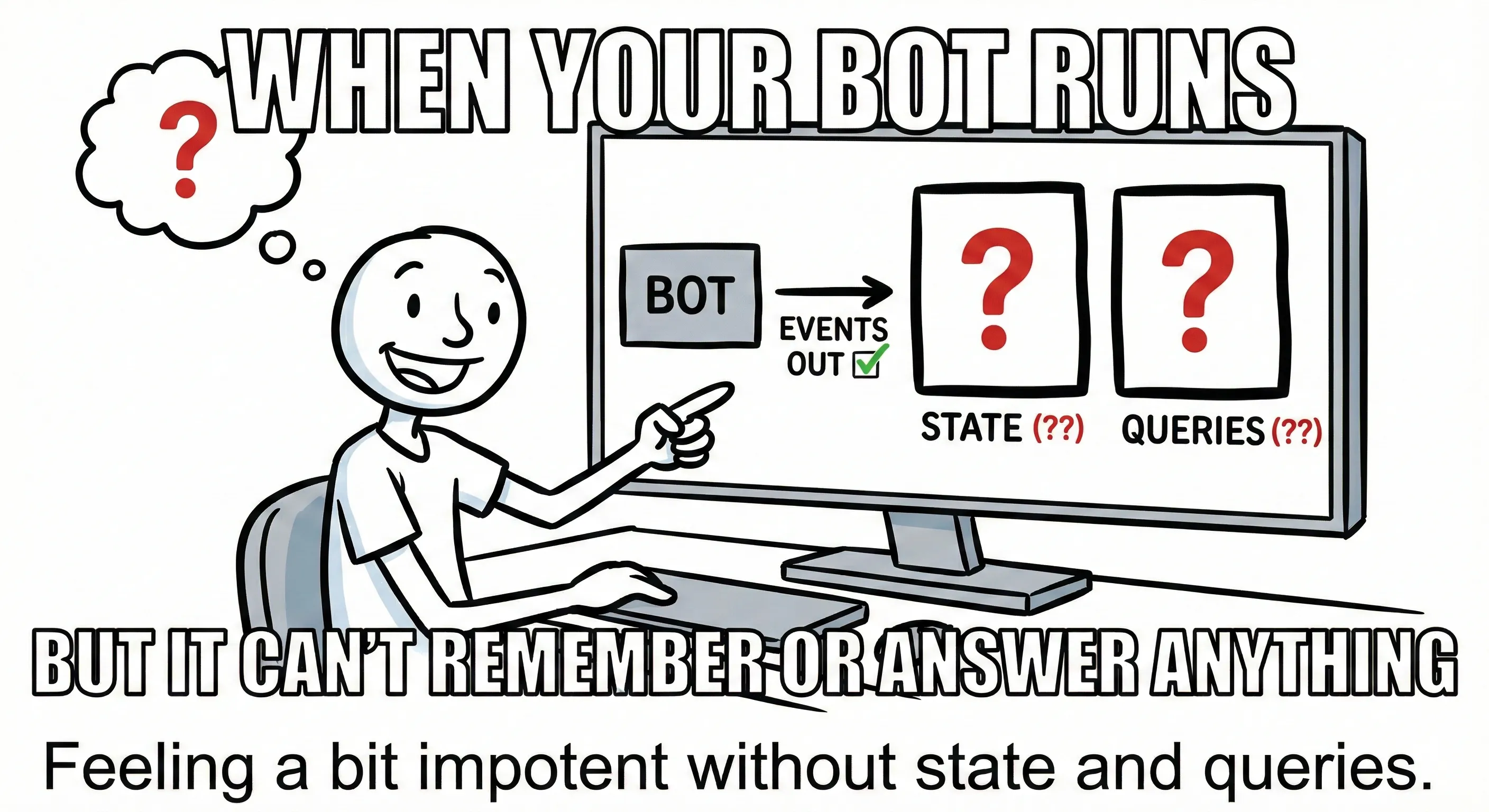 - Every bot has different domain logic. How do we provide a flexible framework that lets developers define their own state structures and query endpoints?